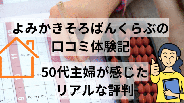 そろばん教室の選び方・体験談 よみかきそろばんくらぶの口コミ体験記|50代主婦が感じたリアルな評判 よみかきそろばんくらぶの口コミ・評判を検証。子どもから大人まで続けやすい理由や、実際の体験で感じたメリット・デメリットをまとめました。 2025.10.06 そろばん教室の選び方・体験談