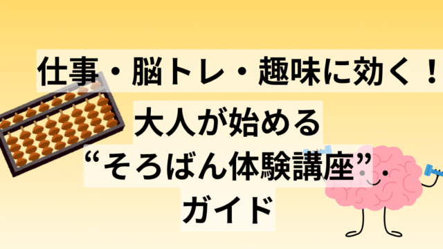 そろばん教室の選び方・体験談 仕事・脳トレ・趣味に効く!大人が始める“そろばん体験講座”ガイド そろばんは集中力・記憶力アップに効果的で、「脳トレ」「仕事の即戦力」としても注目。大人のそろばん学び直しに最適なオンライン講座や体験教室を目的別に紹介。初心者でも安心スタート! 2025.05.01 そろばん教室の選び方・体験談