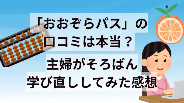 そろばん教室の選び方・体験談 「おおぞらパス」の口コミは本当?主婦がそろばん学び直ししてみた感想 口コミで気になっていた『おおぞらパス』を主婦が実際に体験。そろばん学び直しの感想を本音で紹介します。 2025.05.04 そろばん教室の選び方・体験談