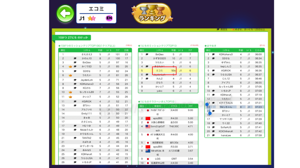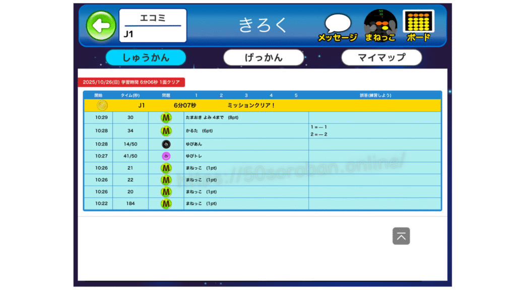 各ステージのクリア時間やミスの数が表示され、進歩が一目でわかります。